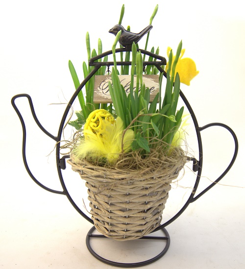 Easter flower arrangement planted in the basket pot and hanged in a fine metallic frame. Includes narcissus, ivy plant and Easter decorations. Pot diameter 16cm.