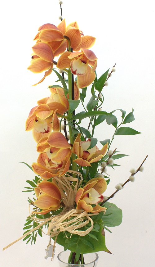 Highly-tied bouquet of orange color cymbid orchid. Also includes catkins, other Easter ornaments and ornamental greens.
