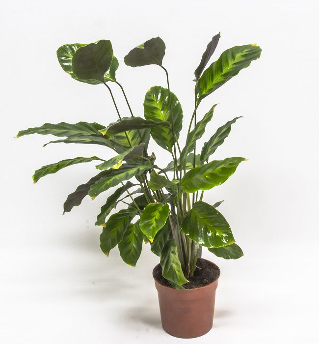 Regularity is an asset in Calatheas watering. It would be good for the soil to remain consistently moist but not wet. Water well at once and then allow the surface to dry before the next watering. Pour off any running water on the saucer. Be careful not to over-water Calathea, especially in winter. Begin fertilizing in the spring with increased light around March or April. Apply fertilizer every three to four weeks until August. Height about 55 cm. Pot size 12 cm.