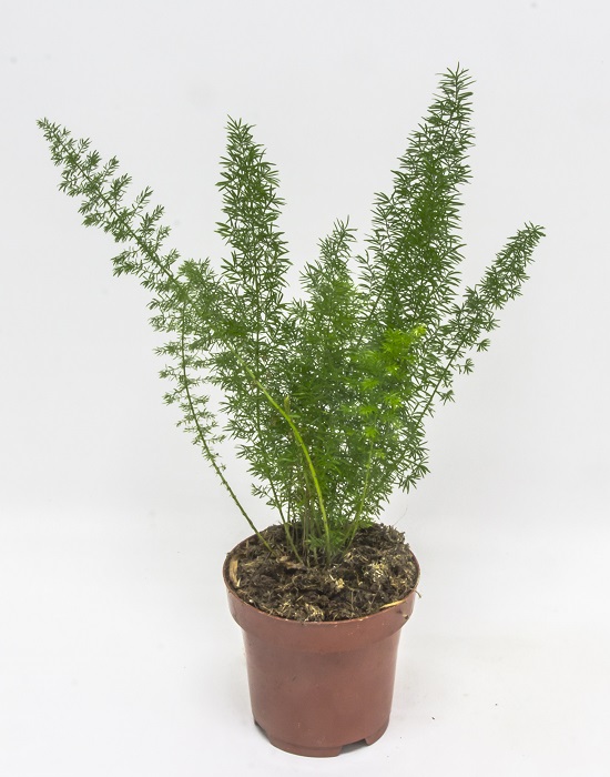 Asparagus densiflorus, Sprengeri. Asparagus are most comfortable in diffused light and at normal room temperature. It does not tolerate direct sunlight due to its delicate leaves. The pot may be reasonably large due to its abundant roots. Asparaguses soil should remain well moist from spring to autumn, but only enough water is needed in winter to prevent the soil from drying out. 2/3 of the soil is good and rest 1/3 for gravel. Fertilizing every two weeks from spring to autumn. Height about 35 cm. Pot size 12 cm