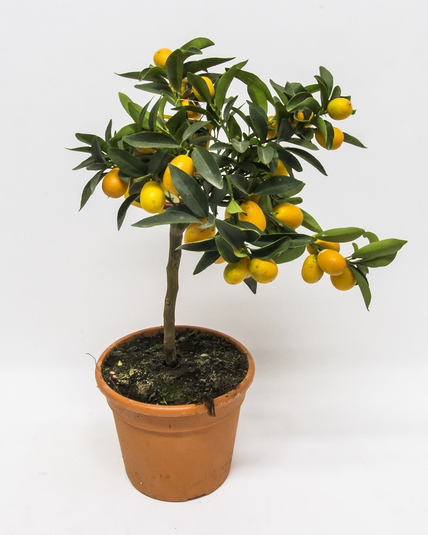 Kumquat plant has white, delightfully fragrant flowers and decorative, edible, yellow-orange small fruits that can be eaten with peel. In summer, the dwarf citrus enjoys the great outdoors, and in the winter, indoor bright and cool place. Watered abundantly in spring and summer, and fertilized every two weeks. Height about 55 cm, pot size 18 cm.