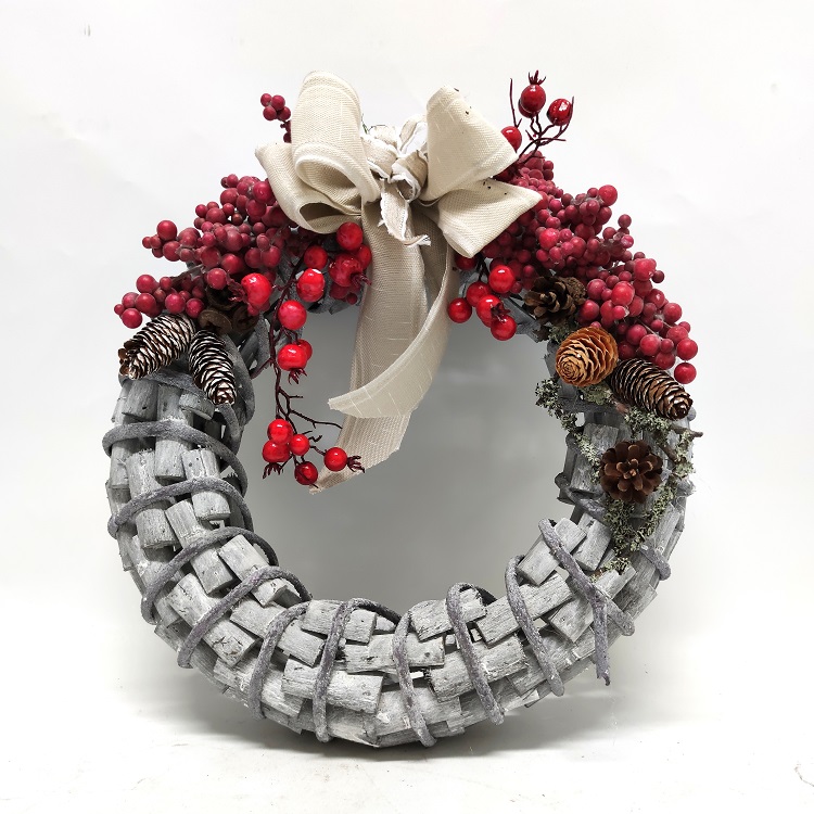 Wooden wreath with cones and berries. Diameter 38 cm and thickness 11 cm.