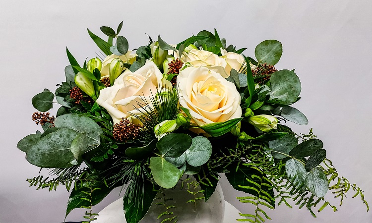 Low tied beautiful bouquet includes roses, skimmias, inca lilies and eucalyptus, as well as other ornamental greens.