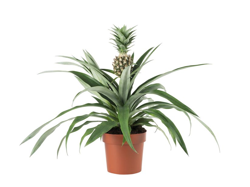 Known as an edible fruit, pineapple is also an exotic and beautiful houseplant. The pineapple has a gray-green leaf rose with a crown at the center of the plant. Pineapple is an easy-to-care green plant when you ensure that the room temperature is sufficient. The pineapple is watered sparingly but evenly. The surface soil may be allowed to dry between waterings. The plant can be fertilized every few weeks. The pineapple soil is changed in the spring when the pot is too tight. Height 40 cm.