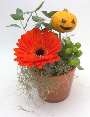 kukka-asetelma sisältää gerberaa, eukalyptusta ja kuismanmarjaa, sekä koristevihreää.