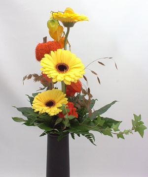 Syksyinen korkea sidottu halloween kukkakimppu sisältää gerberaa, lyhtykoison kukkaa, murattia ja koristevihreitä.