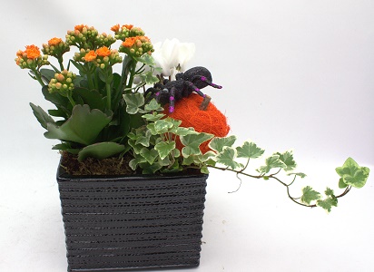 Ruukkuun istutettu Halloween aiheinen kukka-asetelma. Sisältää tulilatvaa, syklaamia ja murattia.