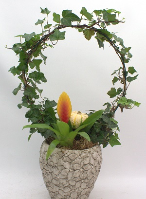 Ruukkuun istutettu halloween, tai syksy aiheinen kukka-asetelma. Sisältää guzmania, murattia ja koristekurpitsaa.