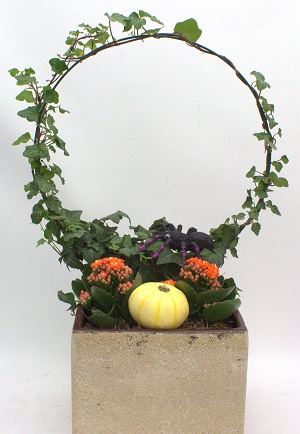 Ruukkuun istutettu halloween, tai syksy aiheinen kukka-asetelma. Sisältää tulilatvaa, murattia ja koristekurpitsaa. Ruukun koko: 18 x 18 cm.