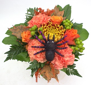 Matala Halloween aiheinen kukkakimppu syksyisissä väreissä. Sisältää neilikkaa, ruusua, kuismanmarjaa, sekä ajankohtaisissa väreissä olevia koristeita.