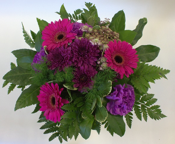 Näyttävä kimppu sisältää gerberaa, neilikkaa, koristevihreää ja kauden kukkia.