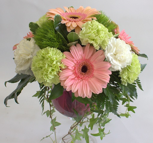 Näyttävä maljakkokimppu sisältää gerberaa, murattia, limenvihreää ja valkoista neilikkaa, tupsuneilikkaa, sekä koristevihreää.