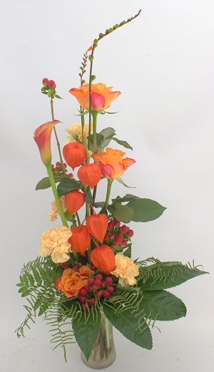 Korkeaan sidottu kimppu kallasta ja neilikasta ja lyhtykoisonkukista, sekä muut koristevihreät.