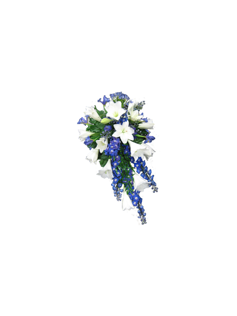 Sinivalkoinen surulaite valkoisista liljoista, ritarinkannuksesta ja koristevihreistä.