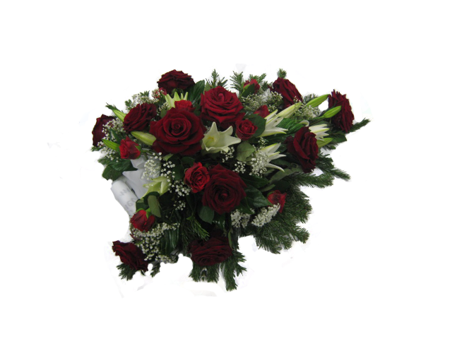 Perinteinen surulaite punaisista ruusuista, valkoisista liljoista, harsokukista ja koristevihreistä.