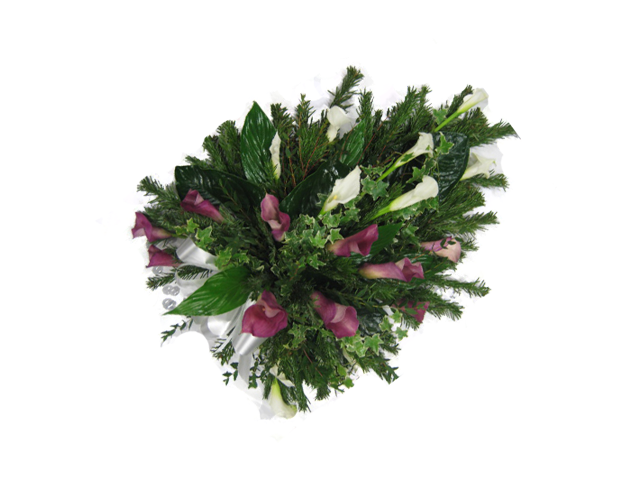 Surulaite valkoisista ja violeteista calloista, sekä koristevihreät.
