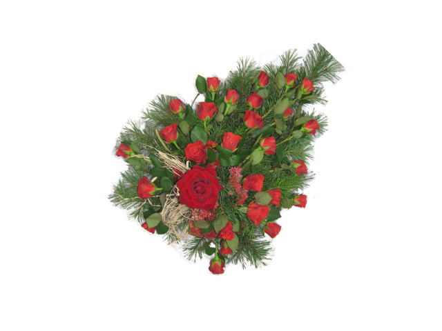 Surulaite sisältää punaisia ruusuja ja havupuun oksia.