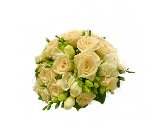 Tiiviisti sidottu pyöreä morsiuskimppu, omin kukkavarsin.