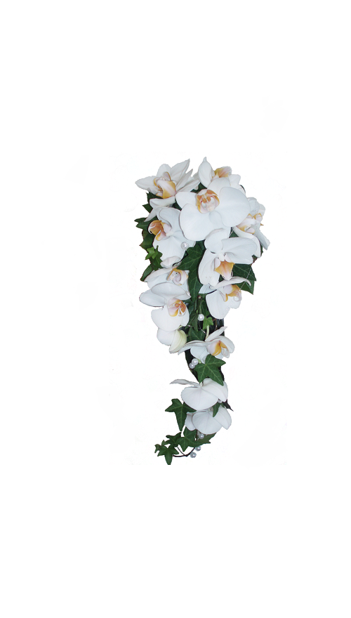 Kaunis laskeutuva morsiuskimppu phalaenopsis-orkideasta ja koristevihreästä.