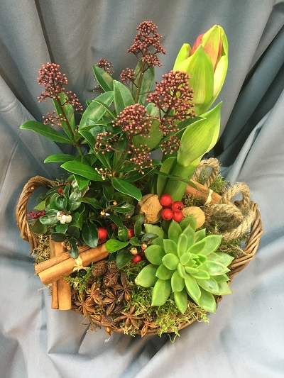 Astiaan istutettu amaryllis, skimmia, muratti sekä kauniit koristeet.
