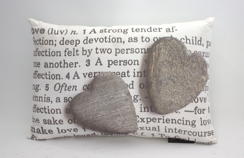 Pitkulainen tyyny, jossa tekstiä ja kuin kolmiuloitteisesti printattuna kaksi sydäntä. Koko 30 x 45 cm, paino noin 0.5 kg.