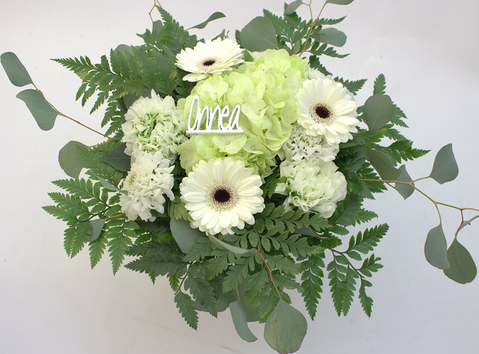 Matalaan sidottu kimppu hortensiasta ja neilikasta. Sisältää myös germiniä, eukalyptusta ja koristevihreitä.