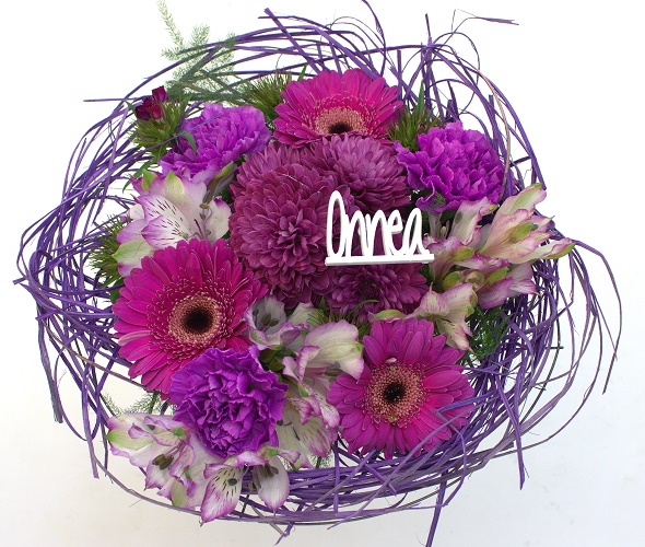 Violettiin kimppupohjaan sidottu matala kimppu. Sis. Germiniä, krysanteemia, neilikkaa, freesiaa ja koristevihreää.