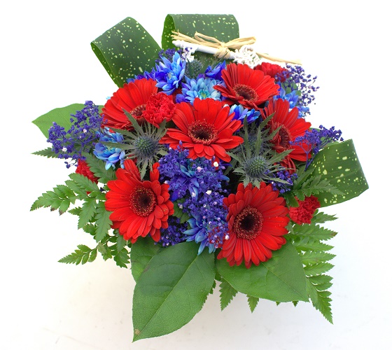 Matalaan sidottu kimppu gerministä ja krysanteemista. Sisältää myös piikkiputkea ja koristevihreitä. Anna lahjaksi vaikka tupaantuliaisiin.
