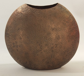 Messinkinen kukkavaasi, korkeus 25 cm, leveys 28 x 10 cm.