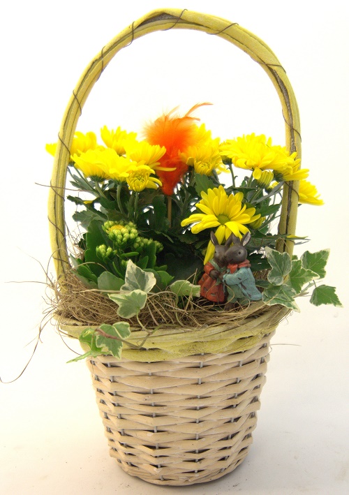 Pääsiäiskukka-asetelma koriin istutettuna. Sisältää krysanteemia, tulilatvaa ja murattia, sekä pääsiäiskoristeita.