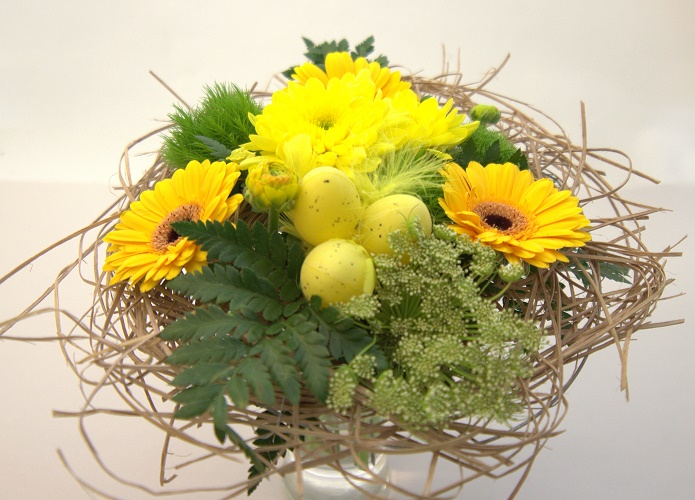 Luonnonruskeaan kimppupohjaan sidottu kaunis matala kimppu. Sisältää krysanteemia, germiniä, neilikkaa, kuismanmarjoja, isosudenporkkanaa sekä koristevihreitä.