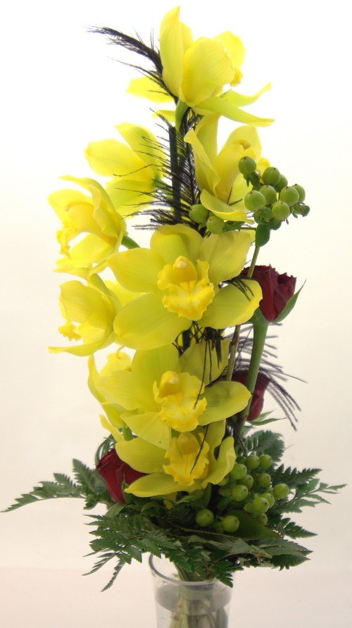 Korkeaan sidottu kimppu keltaisesta cymbidi orkideasta ja ruususta. Sisältää myös kuismanmarjoja ja koristevihreät.