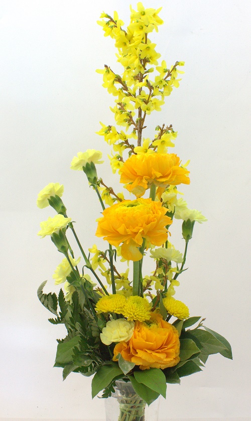 Korkeaan sidottu kimppu onnenpensaasta ja jaloleinikistä. Sisältää myös neilikkaa, krysanteemia ja koristevihreät.