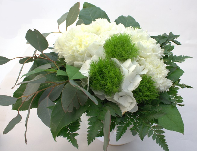Matalaan sidottu kimppu valkeasta hortensiasta ja neilikoista. Sisältää myös vihreitä tupsuneilikoita ja koristevihreät.