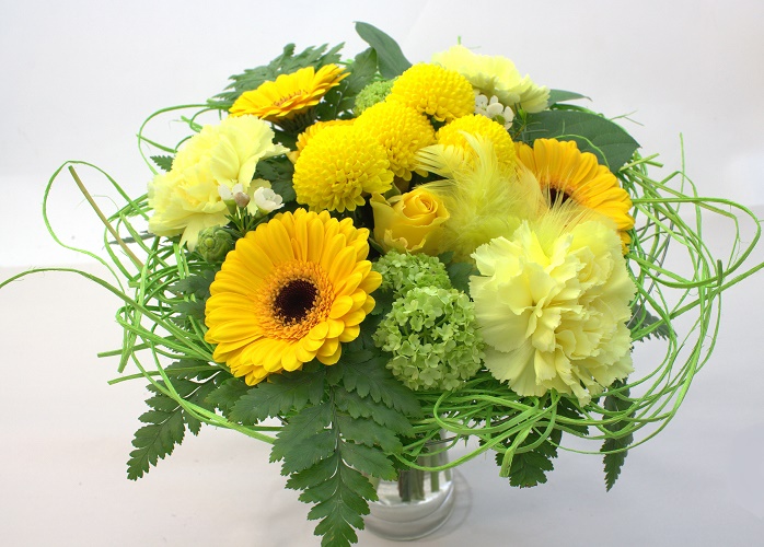 Vaaleanvihreään kimppupohjaan sidottu kaunis matala kimppu. Sisältää krysanteemia, germiniä, neilikoita, vahakukkaa sekä koristevihreitä.
