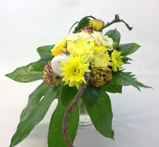 Matalaan sidottu kaunis pääsiäiskimppu krysanteemista ja neilikasta kevään väreissä. Sisältää myös jaloleinikkiä, sekä muita koristevihreitä.