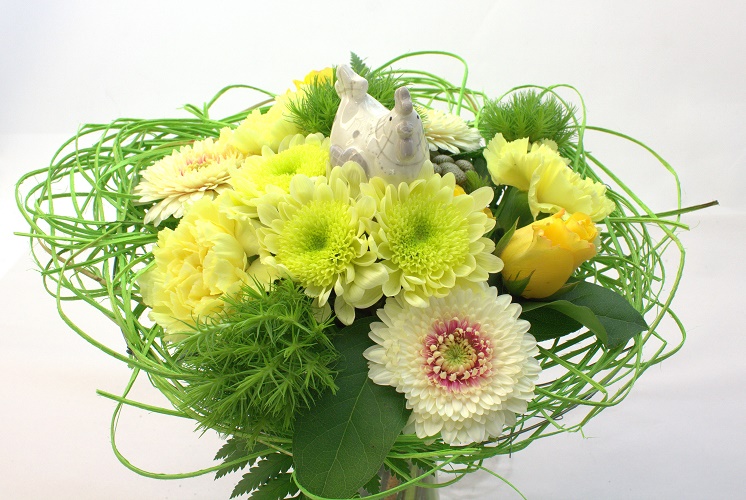 Vaaleanvihreään kimppupohjaan sidottu kaunis matala kimppu. Sisältää krysanteemia, germiniä, neilikoita, ruusua, bruniaa sekä koristevihreitä.