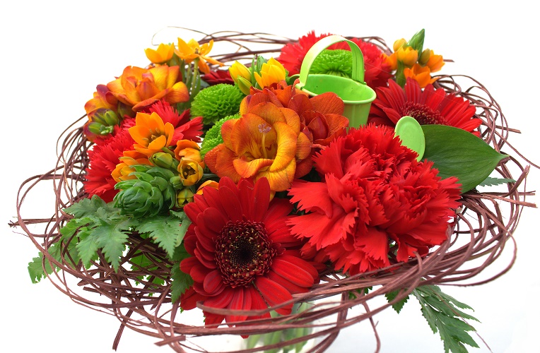 Punaruskeaan kimppupohjaan sidottu kaunis matala kimppu. Sisältää krysanteemia, germiniä, neilikoita, freesiaa sekä koristevihreitä