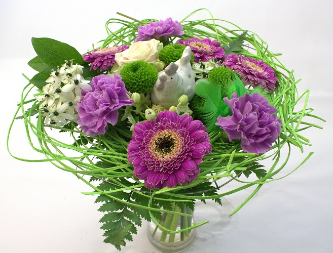 Vaaleanvihreään kimppupohjaan sidottu kaunis matala kimppu. Sisältää krysanteemia, germiniä, neilikoita, ruusua sekä koristevihreitä.