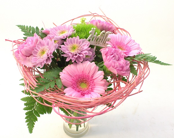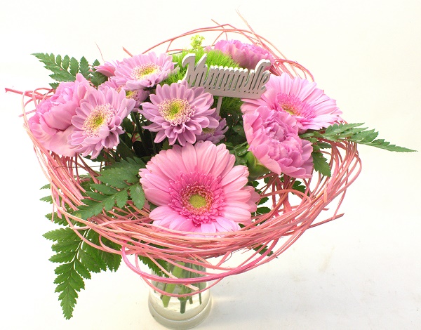 Vaaleanpunaiseen kimppupohjaan sidottu matala kimppu. Sis. germiniä, krysanteemia, neilikkaa ja koristevihreää.