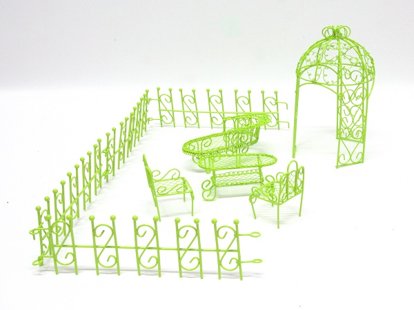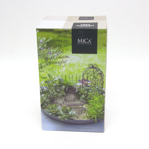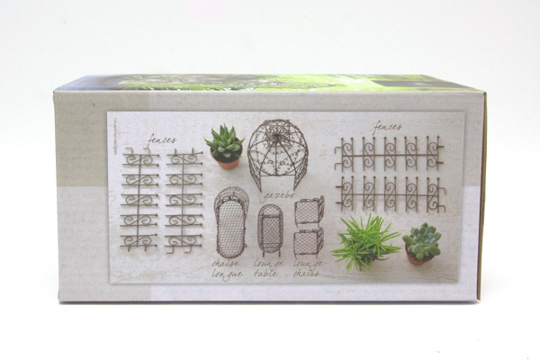 Mica puutarha miniatyyreilla voit tehdä mieleisesi pienoispuutarhan itsellesi sisälle tai vaikka koristamaan terassiasi. Pakkaus sisältää leposohvan, aitaelementtejä, huvimajan, pöydän ja kaksi tuolia. Pakkauksen koko 22 cm x 13 cm x 11 cm.