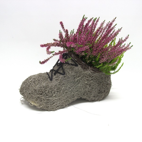 Kenkä istutus sisältää kolmiväristä callunaa. Koko: 34 cm x 36 cm x 16 cm.