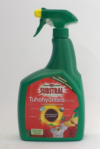 Substral Tuhohyönteisspray on käyttövalmis hyönteisten torjuntasuihke koristekasveille. Vaikuttava aine imeytyy kasvin lehtiin ja leviää nestekierron mukana kaikkialle kasviin (systeeminen vaikutus). Substral Tuhohyönteisspray torjuu kasveja imeviä ja purevia tuholaisia kuten lehtikirvoja, ripsiäisiä, jauhiaisia, kilpikirvoja, villakilpikirvoja, kehrääjäpunkkeja, kovakuoriaisia, hyönteisten toukkia, miinaajia jne. Öljyainesosan ansiosta aine torjuu hyönteiset myös toukka- ja muna-asteella. Systeemisen vaikutuksen ansiosta tuote on tehokas kaikkiin lehtien alla ja päällyskettojen välissä piileskeleviin hankaliinkin hyönteisiin, vaikka torjunta-aine ei niihin suoraan osuisikaan. Tuote sopii käytettäväksi puutarhan ja sisätilojen kasvituholaisiin.