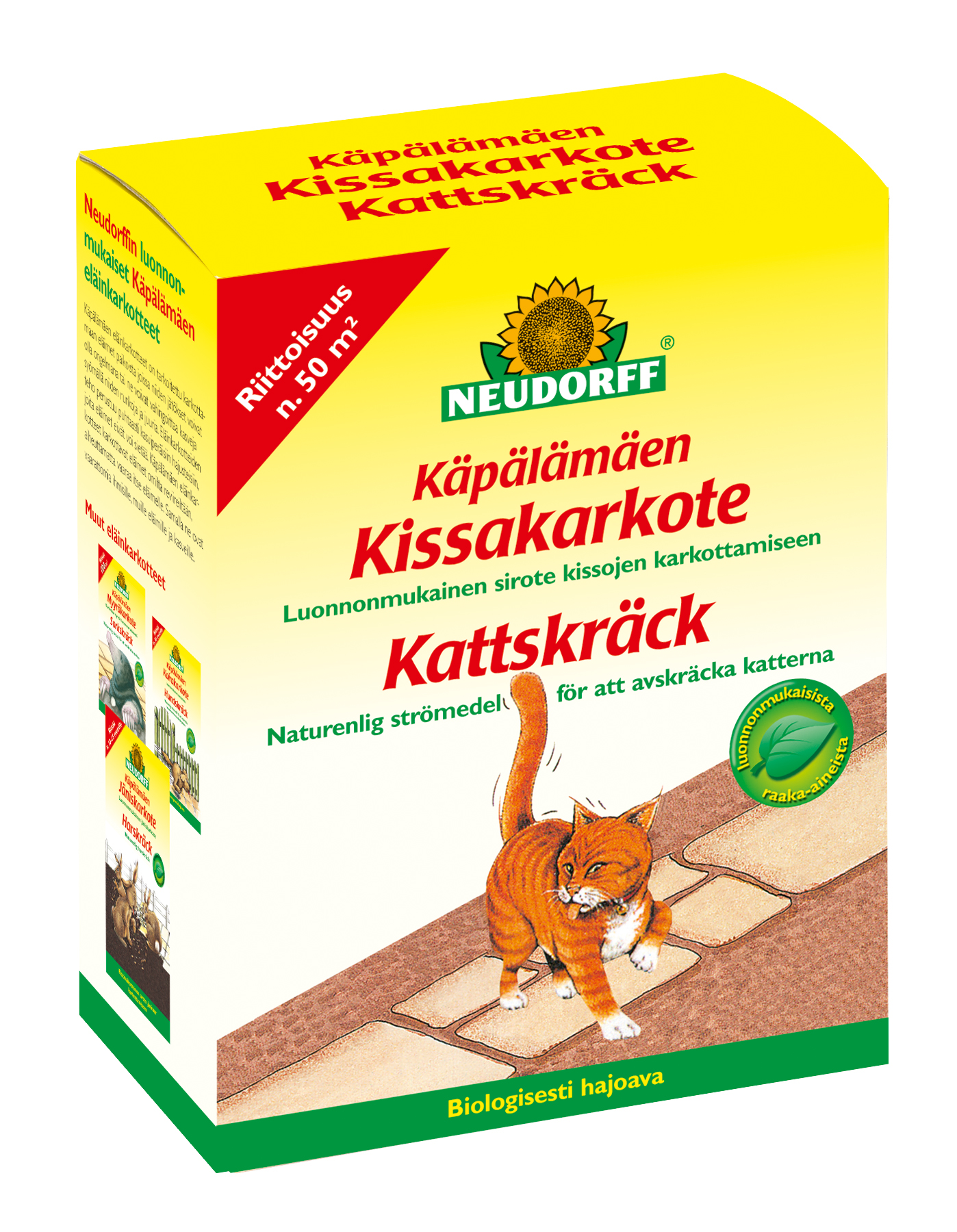 7g/kg laventeliöljy (rakeita). Kestävä haju karkottaa tehokkaasti kissat takapihoilta, terasseilta ja lintujen oleskelupaikoilta. Peittää kissojen reviirille jättämät hajumerkit ja kissat välttävät jatkossa suojattavaa aluetta. Luonnonmukainen, käyttövalmis karkote perustuu vain luonnollisiin mineraaleihin ja kasviperäisiin hajuaineisiin. Antaa 3-4 viikon suojan, säästä riippuen Käyttö: Levitä suojattavalle alueelle noin 4-5 g rakeita hajakylvönä neliömetriä kohti (vastaa n.1 ruokalusikallista)