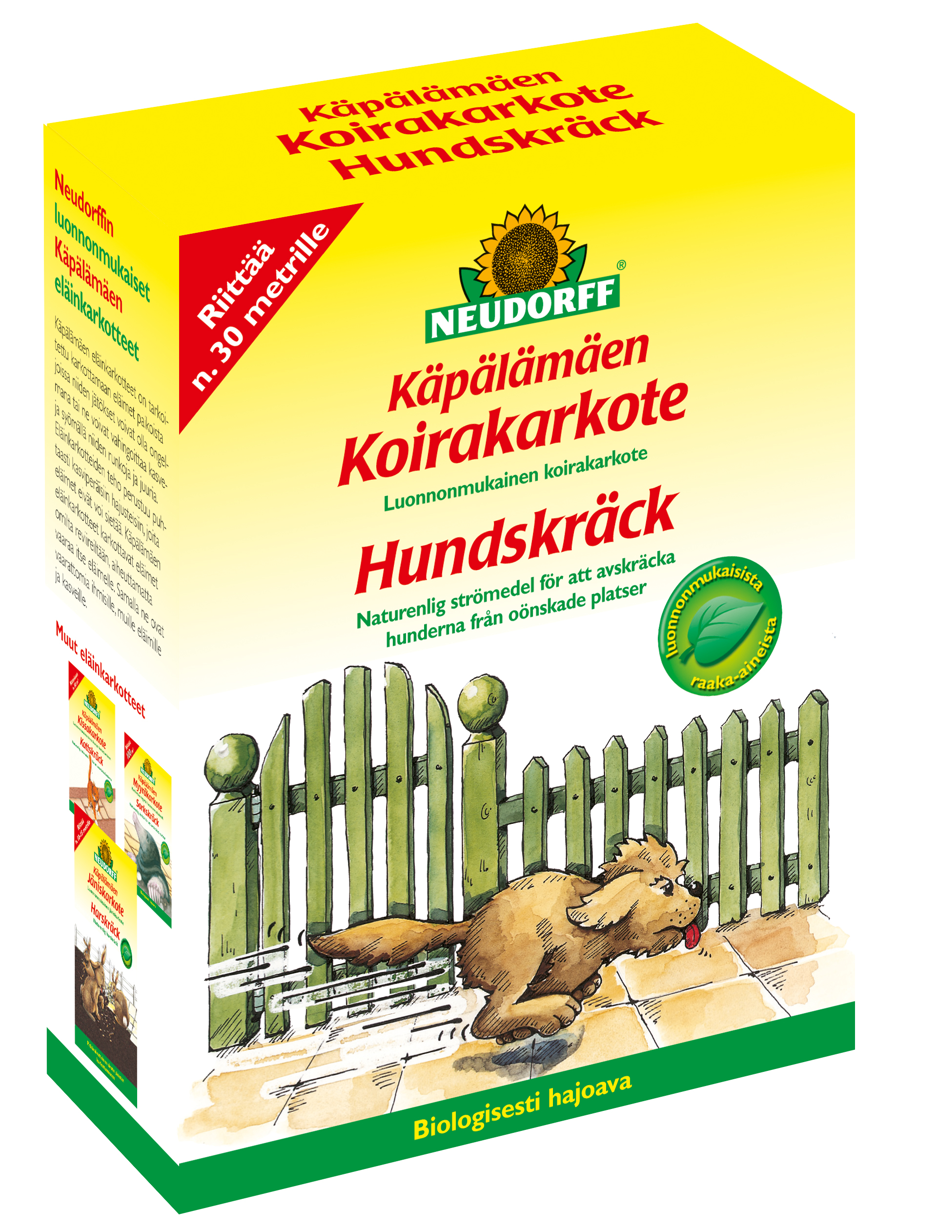 1,5 g/kg laventeliöljy (rakeita). koirakarkote vaikuttaa koirien herkkään hajuaistiin vahingoittamatta eläintä. Luonnonmukainen, käyttövalmis karkote perustuu vain luonnollisiin mineraaleihin ja kasviperäisiin hajuaineisiin. Antaa 3-4 viikon suojan, säästä riippuen käyttö: Sirottele suojattavalle alueelle noin 30 g rakeita hajakylvönä neliömetriä kohti (vastaa n. 4 ruokalusikallista) tai sirota n. 30 cm leveä suojakaistale (n. 10 g metriä kohti). Sisältö: 300 g