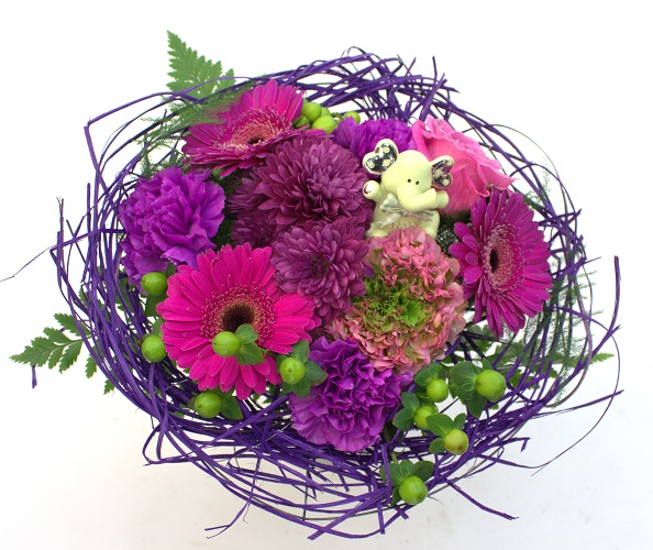 Violettiin kimppupohjaan sidottu matala kimppu. Sis. Gerberaa, krysanteemia, neilikkaa, kuismanmarjoja ja koristevihreää.
