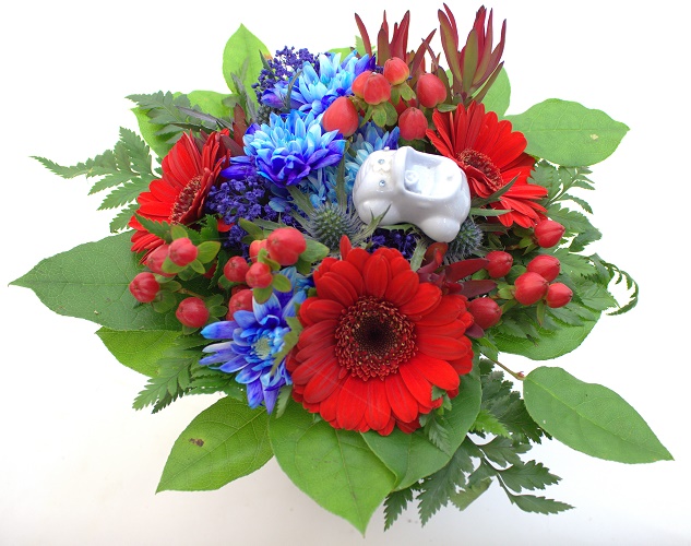 Matalaan sidottu kaunis sinipunainen vauvakimppu germineistä ja krysanteemista, kuismanmarjoista, sinipiikkiputkesta ja koristevihreistä.