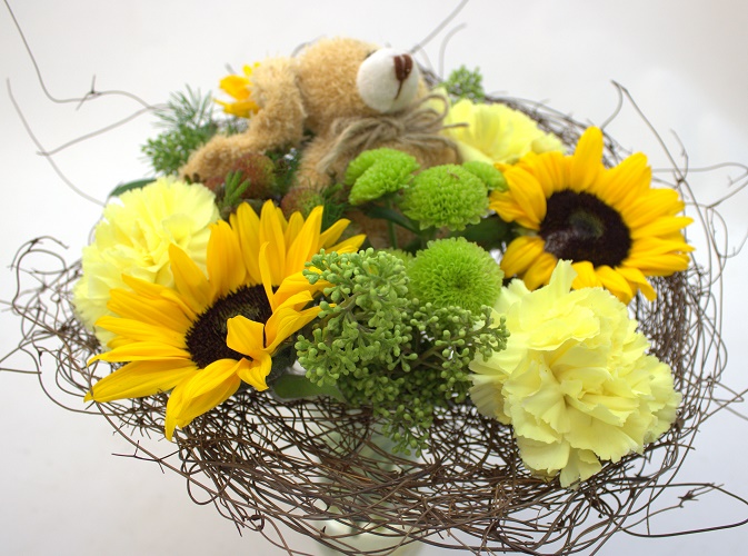 Ruskeaan kimppupohjaan sidottu kauniin keltainen matala vauvakimppu. Sisältää auringonkukkaa ja neilikkaa. Sisältää myös nappikrysanteemia ja koristevihreitä.