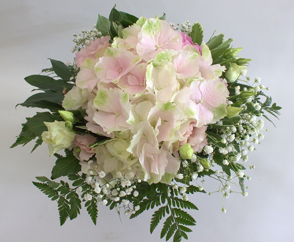 Yksinkertainen ja näyttävä kimppu sisältää eustomaa ja hortensiaa. Lisäksi koristeluun on käytetty harsokukkaa ja koristevihreää.