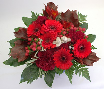 Matalaan sidottu kimppu gerberasta ja neilikasta syksynväreissä. Sisältää myös saniaista, kuismanmarjaa, sekä muita koristevihreitä.